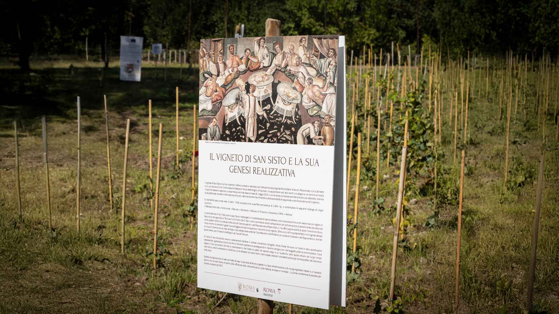 L’obiettivo era ideare una veste grafica capace di connettere il progetto alle radici storiche della viticoltura romana e di accompagnare il primo intervento fisico del progetto: la realizzazione del vigneto di San Sisto a Roma, primo impianto fruttifero concepito come strumento di divulgazione, racconto e valorizzazione del territorio.